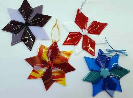 You will then position them into a star/snowflake shape, and decorate them with noodles, stringers, dots, frit, rods and scrap glass.